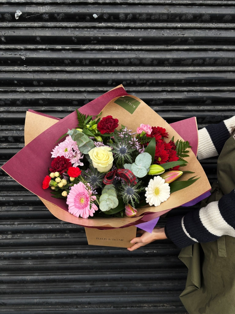 A festive twist on our beloved Highland Fling, the Caledonian Christmas bouquet captures the magic of a Scottish winter’s day. Featuring a rich mix of ruby reds, creamy whites, soft pinks, and seasonal greenery, this arrangement blends traditional festive tones with natural Highland charm. Accented with thistles and a touch of tartan ribbon, it perfectly balances elegance and warmth. Beautifully hand-tied and presented in our signature eco-friendly packaging, Caledonian Christmas makes a striking seasonal gift or a stunning centrepiece for your home this holiday season.
