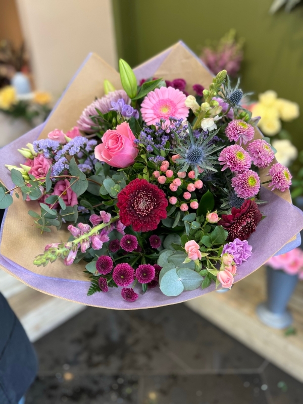 Pictures shown are recent examples of actual bouquets that were designed by our talented in house florists and later sent out to customers just like you! Please note that we cannot guarantee what the flower varieties will be in each bouquet as it is subject to what is fresh on the day. All products, containers and wrapping are subject to availability. In the event of any supply difficulties, we reserve the right to substitute a product of equivalent value and quality without notice. Please also note, seasonal items like hearts etc are not included out with Mothers Day, Valentines Day or the Festive period.
